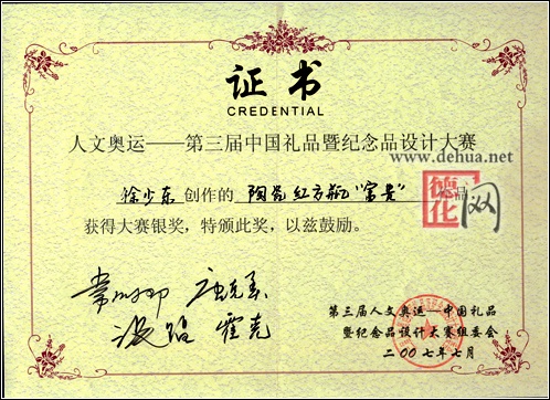 日前,人文奧運——第三屆中國禮品暨旅游紀念品設(shè)計大賽落下帷幕,來自中國瓷都——福建德化縣的富貴紅名瓷“富貴”方瓶獲大賽銀獎。