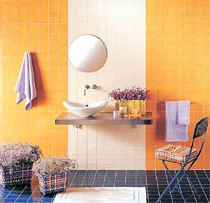 橘黃、米黃墻磚的搭配,過渡自然。圓形的浴室鏡,弧形的面盆構(gòu)成了浴室中的曲線。隔板上的木箱和野花為浴室?guī)砹税蝗簧鷻C(jī)。