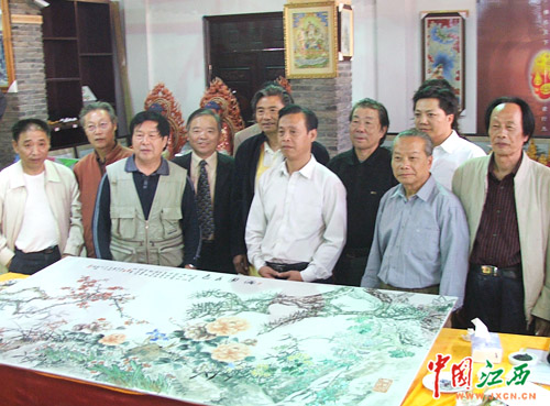 10月19日,中外陶藝家現(xiàn)場技藝交流表演在景德鎮(zhèn)“中華陶藝村”展開。10余位陶瓷工作者合力完成了一幅的“滿圓春色”,博得現(xiàn)場觀眾的嘖嘖稱贊。圖為“滿圓春色”10余位作者合影留念。(中國江西新聞網(wǎng)記者 鐘海泉 攝)