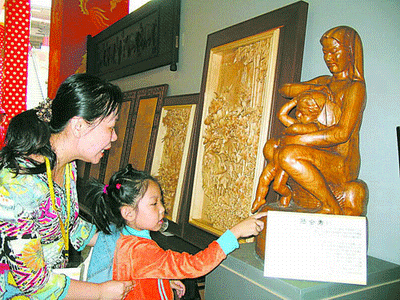 母女欣賞“母子”木雕精品。(朱秀蘭 攝)