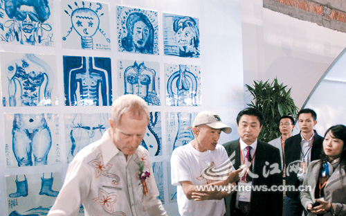 這組青花瓷版畫,是由中國和荷蘭四位藝術(shù)家“四步蛇”共同創(chuàng)作的。當(dāng)一個藝術(shù)家描繪形體的一部分時,用紙遮蓋住先前藝術(shù)家已描繪的圖案。這種不看前者畫面的創(chuàng)作方法,充分發(fā)揮了藝術(shù)家的個人風(fēng)格,多視角展現(xiàn)藝術(shù)家的內(nèi)心世界和對社會的關(guān)注。