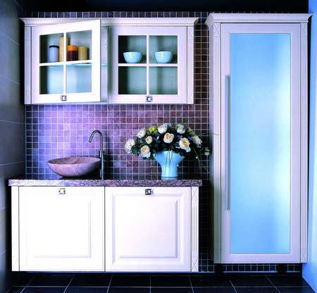 這套浴室家具尺寸并不大,但卻可以將衛(wèi)生間中常用的瑣碎之物――洗面乳、牙刷杯、剃須刀等都巧妙地隱藏在旁側高柜里,同時也可以將其他使用周期稍長的洗滌清潔用品整齊地收藏在面盆下面的地柜中。加上整體的玻璃吊柜,可以拉伸出成倍的空間感。
