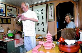 73歲陶瓷藝術(shù)大師吳瑞深(左)技藝精湛,他創(chuàng)作的潮州手拉朱泥壺得到國(guó)內(nèi)外客商的青睞,也使更多的人領(lǐng)略到潮州陶瓷的深厚底蘊(yùn)。
