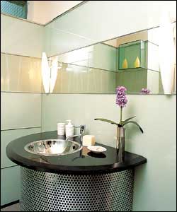 整體風格:因為衛(wèi)生間本身不大,所以這套衛(wèi)生間的墻面采用了高反光的玻璃材質(zhì),地面也用了高拋光的瓷磚,配合以明亮的燈光,衛(wèi)生間看起來大了不少。不銹鋼的面盆、龍頭、透明的淋浴間使整個衛(wèi)生間極富現(xiàn)代感。