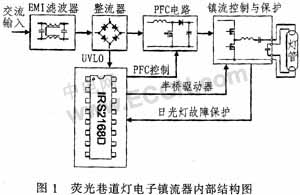 為了節(jié)能,納米陶瓷熒光巷道燈采用電子鎮(zhèn)流器控制。該鎮(zhèn)流器主要由EMT濾波器、整流器、功率因數(shù)校正電路(PFC)、鎮(zhèn)流控制與保護(hù)電路等部分組成,各部分電路均由電子鎮(zhèn)流器專(zhuān)用集成電路IRS2168D控制,如圖1所示!