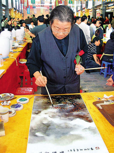 著名陶藝教授李林洪在創(chuàng)作《白云抱幽圖》。