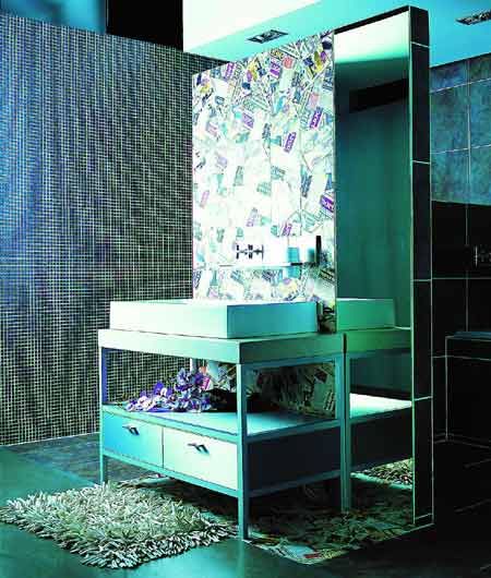 如果你的墻面底色較深就運用博洛尼最大膽的POP花色瓷磚作為主題墻裝飾墻面吧。讓報紙堆砌出的亮麗色彩大面積裝飾,拼貼的效果會使浴室設計看起來更加大氣,配上熠熠生輝拉絲鋁浴室家具和亮面鏡子絕對拉風。張揚的創(chuàng)意是時尚年輕人不二的選擇。