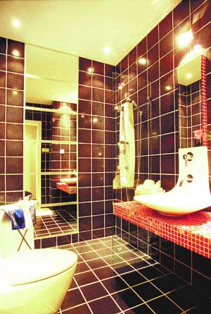 設(shè)計師在設(shè)計中將各種因素集中考慮,進(jìn)行合理搭配,讓材料與設(shè)計合而為一,表達(dá)心情,表現(xiàn)生活。大膽使用黑色與紅色,使衛(wèi)浴空間改變以白色為主的千篇一律,賦予空間冷峻成熟的氣息,清涼中不失浪漫。