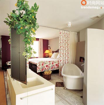令人嘆服的還有對(duì)于空間利用方法的講究和煞費(fèi)苦心,其實(shí)整個(gè)空間是一個(gè)不規(guī)則的梯形,尤其窗戶附近的位置,屬于極難利用的畸零空間,是問(wèn)題之所在。測(cè)量一下,這個(gè)角落空間的寬度恰好可以安裝一個(gè)浴缸,而且嵌入式浴缸是最適合這種格局的,洗浴時(shí)還可以把洗浴用品放在砌起來(lái)的臺(tái)面上。把這部分臺(tái)面和臨近墻壁都鋪貼上與地面一樣的馬賽克材料,還能收到使空間開(kāi)闊的效果。窗戶左手的位置安裝了坐便器和婦洗器,浴室中間立于一面矮墻后的柱式洗面盆別具一格,燈光增加了個(gè)性化的氣息。