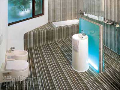 一眼看上去,整個(gè)浴室給人以個(gè)性而前衛(wèi)的第一感覺(jué),這恐怕要?dú)w功于一件件如同個(gè)性符號(hào)般的潔具、大面積鋪貼能夠形成條紋效果的馬賽克、在洗面盆前設(shè)立矮墻及用燈襯托等有新意的物品和裝修方法。