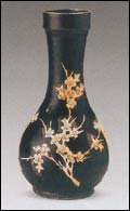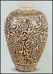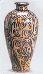 黑釉瓷類 黑釉瓷是吉州窯開放"異彩的山花",又稱之為"天目瓷"。它利用廉價(jià)的天然黑色涂料,通過獨(dú)特的制作技巧,產(chǎn)生變化多端的釉面與紋樣,達(dá)到清新雅致的效果,表現(xiàn)出民間的"實(shí)用藝術(shù)和樸素風(fēng)格"。常見器物有碗、盤、碟、缽、瓶、壺、杯、高足杯、鼎爐、罐、器蓋和玩具等。胎質(zhì)夾細(xì)砂。