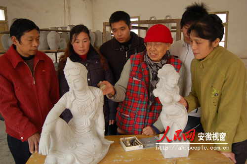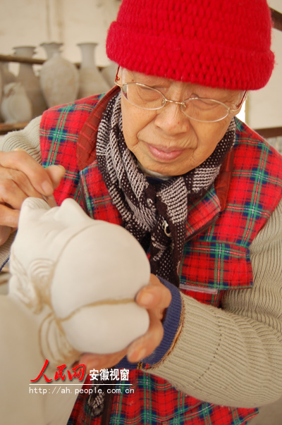 人民網安徽視窗12月10日訊 12月9日,安徽省博物館教授、雕塑家閆玉敏來到安徽界首市向當?shù)氐牟侍账嚾藗魇诘袼芗妓。年?5歲的閆玉敏老人是著名藝術大師韓美林的師姐,曾經在上世紀七十、八十年代三顧到界首陶瓷廠考察,并留下深刻的印象。后來閆玉敏遠赴甘肅擔任了三年的敦煌研究院院長。重回安徽的閆玉敏老人退休后,一直沒有停止陶藝創(chuàng)作和研究。今年10月底,她不顧七十五歲的高齡,拖著患有心臟病的年邁身軀風塵仆仆又一次來到皖西北邊陲界首向當?shù)夭侍账嚾藗魇诘袼懿侍占妓,并打算將自己在敦煌期間的研究成果無償奉獻出來。(王彪 攝影報道)