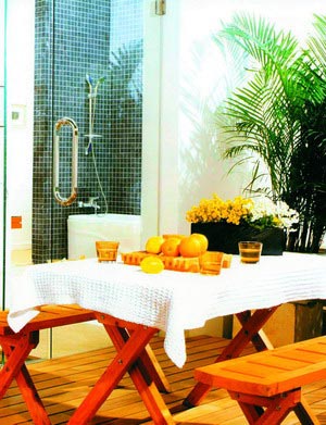 這個(gè)空間關(guān)鍵的地方不在裝修,而是浴室本身是否具備這樣條件的空間:它必須是朝南的,而且前面比較空曠,保證一年四季有大量陽(yáng)光可以進(jìn)入室內(nèi)。
