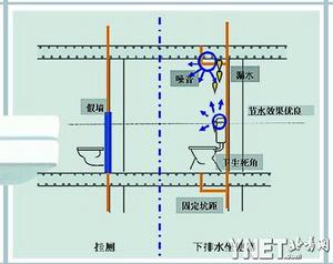 漏水、噪音、衛(wèi)生死角成為最讓人頭疼的衛(wèi)生間三大惡疾,上海吉博力房屋衛(wèi)生設(shè)備工程技術(shù)有限公司北京辦事處經(jīng)理陸紅巖女士告訴記者,衛(wèi)生間的這些問(wèn)題與傳統(tǒng)住宅的排水方式密切相關(guān),一般而言,樓上的馬桶、地漏排水管道都會(huì)穿過(guò)本層樓板,在樓下頂板處打個(gè)彎兒,再走進(jìn)排水管中,這樣,水流的聲音順著管子傳下來(lái),同時(shí),因?yàn)閷訉訕前宕┒炊l(fā)生的漏水現(xiàn)象也屢見(jiàn)不鮮。而且由于建房預(yù)留的管道位置普遍適用于落地式馬桶等潔具,因此在這些潔具與墻體、地面接觸的地方,都會(huì)不可避免地留下難以清理的衛(wèi)生死角。當(dāng)然,固定坑距也對(duì)衛(wèi)生間的空間布局造成了限制。