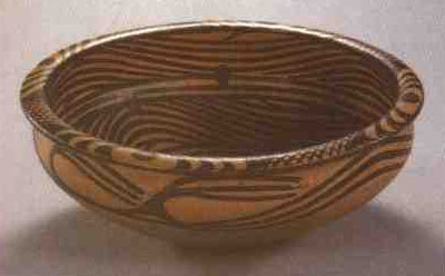 新石器時代馬家窯文化馬家窯類型的陶器,年代為公元前3100至前2700年,因最早發(fā)現(xiàn)于甘肅臨洮馬家窯而得名,直接由石嶺下類型發(fā)展而來。馬家窯氏族經(jīng)濟中制陶手工業(yè)發(fā)達,工藝水平很高,生產(chǎn)的陶器可分為泥質(zhì)紅陶、夾砂紅陶、泥質(zhì)灰陶等陶系。夾砂紅陶主要作炊器和盛儲器,在成型時表面做出繩紋、附加堆紋。泥質(zhì)陶種類多,在生活中使用廣泛,有素面磨光陶,也有彩陶。馬家窯類型的彩陶最精美,陶器細膩,底色呈橙黃色,少數(shù)呈磚紅色,表面打磨光亮,大多數(shù)用黑彩在器物的口沿、頸腹最圓鼓的部位和內(nèi)壁繪畫裝飾。紋飾以幾何形圖案為主,構圖飽滿復雜,出現(xiàn)最多的有垂幛紋、垂鉤紋、圓點紋、波浪紋、平行條紋、弧線三角紋、葉狀紋間網(wǎng)紋、葫蘆形紋、菱形網(wǎng)紋、螺旋紋、圓圈紋、S形紋等。人物類畫面最精采的是紅陶盆內(nèi)壁5人一組攜手舞蹈的紋飾,它是研究新石器時代舞蹈藝術和氏族成員娛樂生活、風俗人情的寶貴資料。動物紋飾有變形鳥紋、狗紋等。馬家窯類型遺址發(fā)現(xiàn)有規(guī)模很大的制陶作坊,生產(chǎn)的器物有碗、缽、盆、瓶、壺、罐、甑、甕、帶嘴鍋。還有上部為泥質(zhì)陶彩繪、下部為夾砂耐火粗陶的器物,如盆、罐、帶嘴鍋相結合的器物,適應人們?nèi)找尕S富、廣泛的生活需要,表現(xiàn)了工藝的嫻熟和生產(chǎn)安排的靈活性。(見下圖)