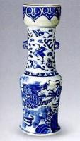 特征:直口呈墩式瓶狀,頸部飾雙獸耳,豐肩收腹,足部外撇。通體繪如意頭、云鶴、云龍三組紋飾,畫意粗獷豪放。此物應為佛前供器。