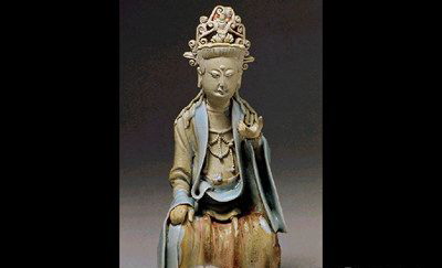 觀音作坐勢。頭戴寶冠,以結跏坐于蓮座之上,身著廣袖低領外衣,坦胸,面目豐腴,耳后有長發(fā)披于肩。手指細長。左手下垂撫于膝,右手上舉,做說法狀。瓷質細白堅致。大部露臺素燒,僅在衣襟、袖口、胸前等處施青白釉,釉色淡青,聚釉處為水綠色。在露胎的寶冠、衣裙等處飾以綠彩。惜大部以剝落。塑像底部有墨書題記,楷書"大宋淳祐二十一年辛亥"(公元1251年)九字清晰可辨。