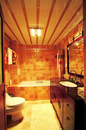 中式風(fēng)格一直延伸到衛(wèi)生間里,浴室柜上依然是古色古香的鎖扣和雕花的圖案,搭配鏡子的邊框和射燈,與現(xiàn)代的衛(wèi)浴設(shè)施很好地融為一體。內(nèi)嵌式的浴缸在增加空間層次的同時也縮短了空間的狹長感。設(shè)計師采用了花色的瓷磚,在燈光下營造出溫暖輕松的環(huán)境。