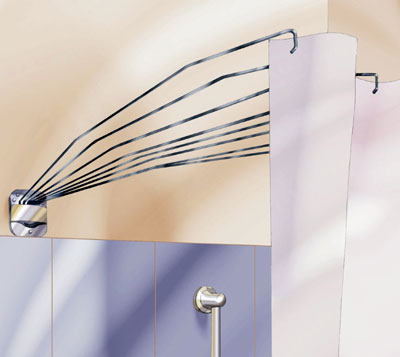 浴簾。非常有創(chuàng)意,是用幾根鐵絲做成傘骨一樣的拉桿掛上浴簾,拉開就像半把傘,正好罩住淋浴范圍,不會濺濕旁邊木臺上的東西。
