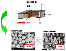 圖:MLCC截面(上)。在內(nèi)部電極中使用的超細(xì)鎳粉(左下)和用來(lái)比較大小的流感病毒(Influenza Virus,右下)。