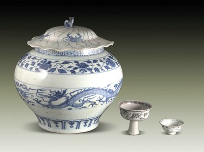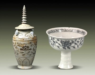 圖2 九江延六年墓出土的青花牡丹紋塔式蓋罐  館藏延型高足杯