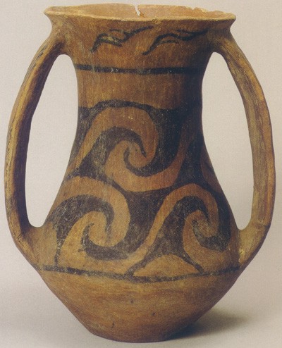 彩陶大雙耳罐。辛店文化泥質黃陶?陬i部與腹部為對稱雙耳相連接,使造型貫通一氣,器身虛空間比例合理。器表施用紅色陶衣,飾以黑色渦紋,華麗大方。