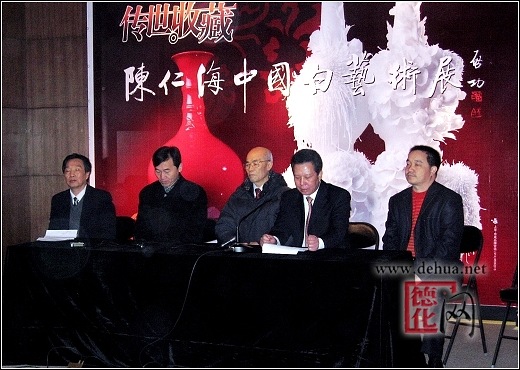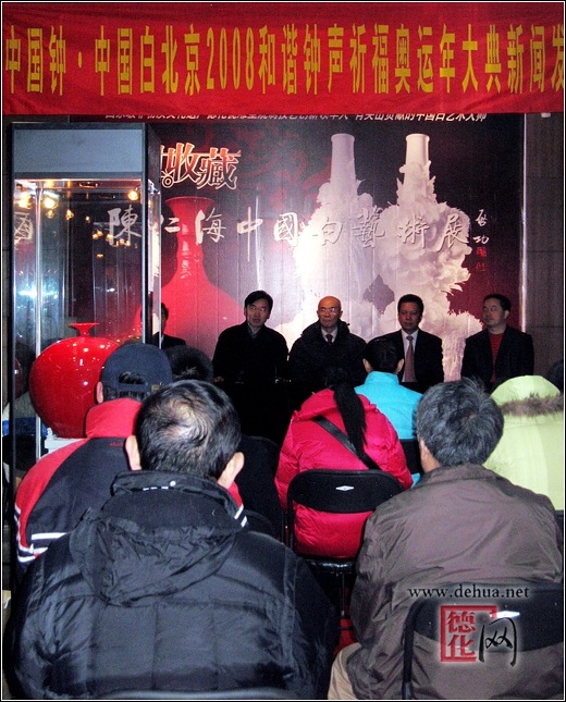 副縣長黃耀昆參加發(fā)布會,并向與會的媒體記者介紹了我縣的陶瓷文化歷史和陶瓷產(chǎn)業(yè)現(xiàn)狀;辛默樓藝術(shù)總監(jiān)陳仁海介紹了本次展覽的作品及創(chuàng)作感想;中國收藏家協(xié)會會長閻振堂,北京大鐘寺古鐘博物館書記、副館長吳志友,中國社科院文化史研究室主任、研究員丁守璞等也在發(fā)布會上發(fā)表了熱情洋溢的講話,高度評價了中國瓷都·德化和德化陶瓷精湛的工藝水平、藝術(shù)成就。