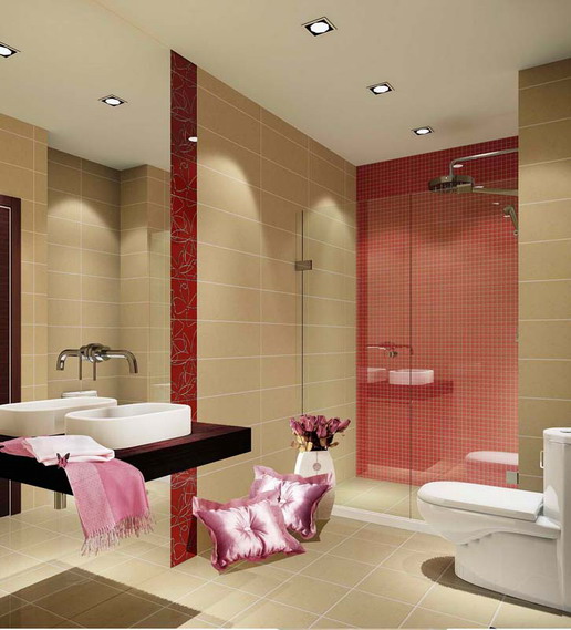 在大浴室中用墻面分隔區(qū)域是個(gè)值得稱道的小計(jì)謀,平凡的米色墻面和地面雖然干凈但并不出奇,但加上一條Art deco風(fēng)格的紅色裝飾線就大大不同,轉(zhuǎn)瞬間就成為浴室中最惹眼的設(shè)計(jì),瓷磚顏色和圖案成為女性