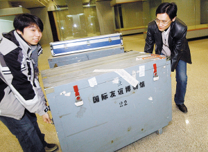 昨天下午1時許,在工作人員嚴(yán)密押送下,4個裝載著國禮珍品的密封箱運(yùn)抵周鄧紀(jì)念館院內(nèi)。還未見珍品,那些專門為展品“量身定做”的箱子就讓人很感興趣,每個箱子都有1米多高,由于展品極其珍貴且是易碎品,在包裝時里面不僅加了防震的材料,箱子外面也特別注明易碎標(biāo)志,每一件珍品都被固定在專門的錦盒中,且是根據(jù)它們的大小和形狀量身定做的。