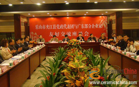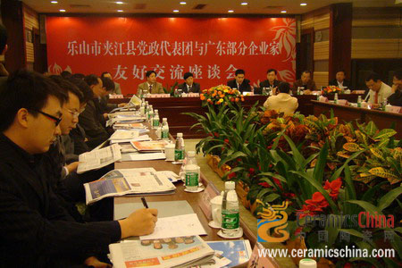 。ū揪W(wǎng)訊 主編 蘇振明 特約記者 洪秀明 攝影報道)1月6日下午,由樂山市和夾江縣政府領(lǐng)導(dǎo)班子組成的招商考察代表團,在佛山華夏新中源大酒店舉行市情介紹和招商洽談會議,佛山市陶瓷行業(yè)的陶瓷、機械、化工、馬賽克等產(chǎn)業(yè)的數(shù)十家企業(yè)代表應(yīng)邀出席了會議。