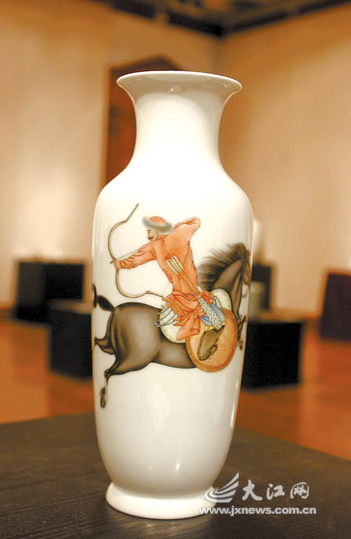 你看,“墨彩荷塘清趣瓶”以瓷作畫,又有瓷器的瑩潤質(zhì)感。殘荷上,青蛙、螃蟹各一,似乎在打擂臺。一只蜻蜓飛于瓶口之下,饒有情趣,足以喚起觀者對康熙殘荷秋趣瓷畫的回憶;“秋獵圖瓶”上,獵手身體翻轉(zhuǎn),嘴角緊抿,眼神炯炯。黑馬四蹄騰空,強(qiáng)烈的光感表現(xiàn)出健勁的肌肉,凸顯出駿馬矯健的身姿,又更襯托出獵人的神勇;“琺瑯彩杏林春燕碗”杏花朵朵,楊柳青青,春燕翩翩,每組細(xì)節(jié)各具情態(tài),鮮明有致,渲染出一片明媚的春光,整個圖案寓意吉祥如意。這就是江窯的瓷器,乍看精美,再賞值得玩味,令人過目難忘。