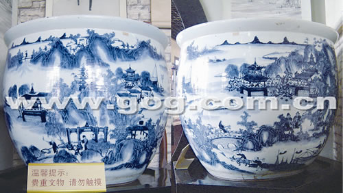 這兩口大缸口徑和高度都不到1米,缸表面繪的是些山水、人物(如圖)。畫上的人物既有劃船打魚、挑擔的勞動人民,也有達官貴人、才子佳人慢步庭院。畫上的山水清新自然,錯落有致,十分精美。