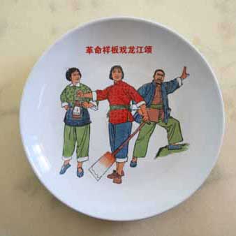 在農(nóng)貿(mào)城一爿古玩商店,擺放著不少“文革瓷”,店主指著一套八只革命樣板戲內(nèi)容的瓷盤介紹說,這是他2000年從江蘇一個朋友處換來的,當(dāng)時只有千把元錢,但現(xiàn)在能升值幾萬元吧。他說,講起來對朋友還有點不好意思,不過給朋友的東西也升了,只是升的空間沒這個大。這位店主介紹道, “文革瓷”大致可以分為日用瓷器和觀賞瓷兩大類,觀賞瓷的藝術(shù)水平和價值普遍要高于日用瓷,當(dāng)時人們看到較多的是領(lǐng)袖瓷器塑像、八大革命樣板戲、乒乓外交、太平天國英雄人物造型以及“紅衛(wèi)兵”塑像等內(nèi)容。同時期的日用瓷包括杯、壺、碗、盤、瓶、筆筒等,上面大多有“文革”特征的圖案。