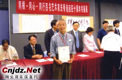 近日,河北省邯鄲市峰峰礦區(qū)陶瓷大師閆保山攜女兒閆英(陶瓷一級藝術(shù)家)應(yīng)邀參加了由中國文化名家協(xié)會、中國國際友好交流促進(jìn)會、中國海峽兩岸文化經(jīng)濟促進(jìn)會共同舉辦的“同根、同心、同行”百名藝術(shù)家慶香港回歸十周年書畫展,該展會在香港上環(huán)文藝中心召開,全國各省(市)百名書畫家及諸多書畫有業(yè)績者蒞臨大會。會上,閆保山和女兒閆英被授予“中港文化使者”榮譽稱號。所展作品會上經(jīng)權(quán)威專家認(rèn)真篩選評審,閆大師書畫作品《磁州窯圖案》獲金獎,為省、市爭得了榮譽。