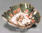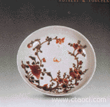 粉彩盤:有圓盤及荷頁盤兩類,紋飾以花鳥為主,云龍、人物次之,彩繪多施于盤內(nèi)中心。一些花鳥盤,花卉的布局,蜂蝶的綴飾,鳥兒的棲與飛,呈現(xiàn)動(dòng)與靜的完美結(jié)合,構(gòu)成一幅協(xié)調(diào)完整的畫面。如搖曳多姿的迎春花卉中,蝶戀花,蜂采蜜,枝頭鳥兒鳴。尤其那鵲梅迎春的畫面,呈現(xiàn)出一派滿園春色的景象。圖案顯得既清新典雅又鮮艷俊秀(圖3)。云龍盤,盤心彩繪翻江倒海的四爪龍。在那烈焰升騰中龍身三現(xiàn),張牙舞爪,蜿蜒起伏于云浪間。那雄渾矯健、叱咤風(fēng)云的磅礴氣勢,或許比官窯器的彩龍顯得更生動(dòng)敏捷(圖4)。荷頁盤,盤作葉片狀,盤心株蓮怒放,立于蓮池中央,茂盛的花頁,本固枝榮(圖5)。