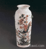 粉彩瓶:在諸多彩瓶中,具有代表性的是錦雞筒式瓶。它平口,折唇,束頸,溜肩,長筒式。在那如脂似玉的白釉瓶壁上,遠(yuǎn)景依稀可見山水林舍,近景滿飾荷蓮牡丹、洞石花草。蜂蝶飛舞期間,地上卵石間佇立一對鵓鴿,昂首顧盼,突出了瓶面展翅的錦雞引頸而鳴的英姿,呈現(xiàn)出一派春光明媚的景象(圖6)。