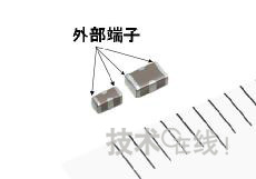 圖:TDK可調(diào)節(jié)ESR的積層陶瓷電容器。外部端子看似有4個(gè),但實(shí)際的外部端子與普通的原積層陶瓷電容器一樣,只在兩端有。側(cè)面看似端子的部分是用于在內(nèi)部電極之間進(jìn)行連接的布線。