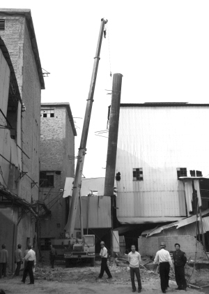 去年12月10日,南莊羅南村奧麗斯陶瓷有限公司設(shè)備拆除現(xiàn)場,大型煙囪被吊倒。