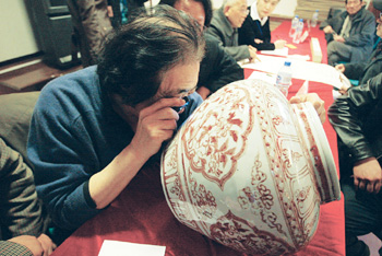 官窯瓷盤的出現(xiàn)讓現(xiàn)場掀起了一個小小高潮。上午11時30分,在多名保安人員的護(hù)衛(wèi)下,一件大連收藏者的巨大古瓷瓶出現(xiàn)在會場主席臺上。這件瓷瓶出現(xiàn)后,6位主持鑒寶的專家立即圍攏上來,這件瓷瓶成了會場的焦點(diǎn)。