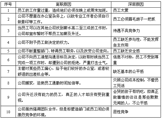 “如果你想穩(wěn)住你的銷量,首先你必須有一支能征善戰(zhàn)而又穩(wěn)定的營銷隊(duì)伍。怎樣穩(wěn)住你的隊(duì)伍,你得給員工以不走的具有競(jìng)爭(zhēng)力的理由,也就是說,員工在你這里可以得到什么?美國企管顧問史密斯根據(jù)他多年的顧問經(jīng)驗(yàn),總結(jié)出員工離職的十大原因,大致為: