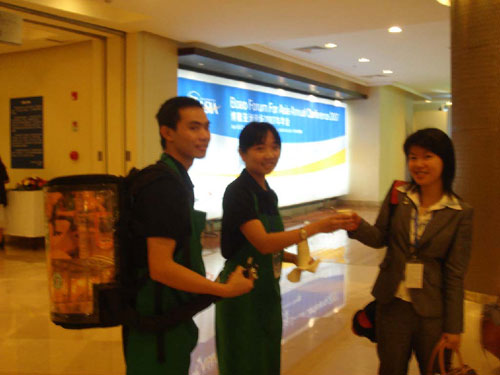 除了休息區(qū)里面服務(wù)周到外,在會場通道里,星巴克也不放過一個(gè)機(jī)會進(jìn)行自我品牌的營銷,他們的方法并不是簡單地掛牌宣傳和招募人員發(fā)送宣傳資料,而是非常具有親和力地走到人群中間用非常趣味性的方式讓人們免費(fèi)品嘗咖啡。一男一女兩個(gè)帥哥美女,男的背個(gè)五彩的咖啡桶,女的手拿小紙杯,咖啡雖然是簡單的黑咖,但是當(dāng)人們看到這樣友好輕松的服務(wù)的時(shí)候,已經(jīng)不在意其咖啡味道了,而品牌的推廣則已經(jīng)深入人心了。