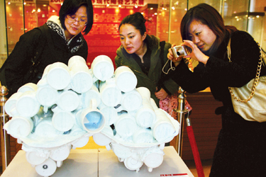 在展廳里走走看看,就像到了一個(gè)想象飛舞的創(chuàng)意世界。瞧,美國(guó)藝術(shù)家丹·貝爾把一堆杯狀廢棄物組合在一起,裝窯、澆釉、燒結(jié),最終變廢為寶,成了一件藝術(shù)精品,有了“只在此山中,云深不知處”的韻味。