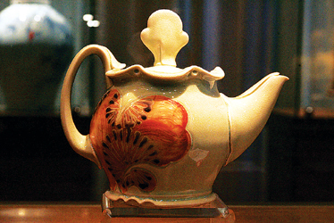 還有一些作品外形卡通,引起許多少兒觀眾的喜愛。比如《霜打的狗兒》,白色的“霜枝”覆蓋在棕色的哈巴狗頭上,鳥兒逗弄慵懶的狗兒,畫面栩栩如生。壺、碗,被印上大象、松鼠等可愛的圖案;籃子長(zhǎng)得像企鵝,盤子下長(zhǎng)著像八爪魚那樣的“腿”。