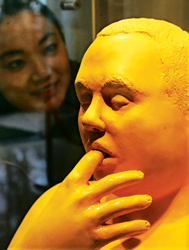 “耐克”鞋里印著仕女圖,胖漢閉著眼睛吮手指,小鳥倚著籃筐棲息……這些有趣的畫面是陶瓷名家的奇思妙想。“燭光瓷語——2008上海世界現(xiàn)代陶瓷藝術(shù)展”正在上海工藝美術(shù)博物館舉行。來自中國(guó)、美國(guó)、荷蘭、新西蘭等9個(gè)國(guó)家的26名藝術(shù)家?guī)?00多件陶瓷珍品。