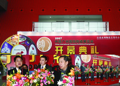 3月18日上午9點半,“2007中國廣州國際陶瓷展覽會”開幕式在中國出口商品交易會琶洲展館珠江散步道隆重舉行。中國對外貿(mào)易中心(集團)代表、中國對外貿(mào)易廣州展覽公司副總經(jīng)理馬國勤、中國輕工業(yè)聯(lián)合會副會長、中國陶瓷工業(yè)協(xié)會理事長楊自鵬,潮州市市委書記駱文智,潮州市市長湯錫坤,湖南省商務(wù)廳副廳長周船,廣西商務(wù)廳對外貿(mào)易處處長顧章偉,福建省德化縣副調(diào)研員黃發(fā)建,香港陶瓷商會會長陳國柱等領(lǐng)導出席了開幕式。河北唐山、邯鄲,山東臨淄、臨沂,江蘇南京、宜興,江西景德鎮(zhèn),重慶等重要陶瓷產(chǎn)地的代表也參加了開幕式。