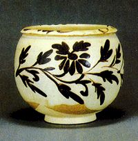 在磁州境內(nèi)(今磁縣觀臺(tái)鎮(zhèn)、彭城鎮(zhèn)一帶),故名。建于宋代,所燒器物純供民間使用,品種繁多,如瓶、罐、盆、碗、缸、甕等,以白地黑花(屬釉下彩裝飾)為主要特征。白地黑花保留了不少民間喜聞樂(lè)見(jiàn)的紋飾,如馬戲、孩童釣魚(yú)、池塘趕鴨、蹴球等,題材豐富而清新,紋飾線條流暢豪放,黑白色彩對(duì)比強(qiáng)烈,發(fā)展了陶瓷的裝飾藝術(shù),當(dāng)時(shí)深受北方地區(qū)人們喜愛(ài),曾對(duì)南北方不少瓷窯產(chǎn)生很大影響。