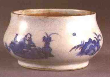 明代晚期天啟至祟禎年間(1621~1644年)景德鎮(zhèn)民窯生產(chǎn)的青花瓷器。萬(wàn)歷四十八年(1620年)御窯廠停止生產(chǎn)以后,景德鎮(zhèn)民間瓷窯仍很活躍、晚明青花大多數(shù)是民窯即不署年款的瓷器,有少數(shù)作品如“天啟年制”款青花瓶等—類作品,可能是御窯廠的窯工還在繼續(xù)生產(chǎn),明朝社會(huì)動(dòng)蕩不已,官窯署款,民窯不署款的慣例有些并不嚴(yán)格遵守。當(dāng)時(shí)社會(huì)各階層對(duì)青花瓷器的需求量較大,瓷器外銷也很活躍,官府限制松弛,從而使民間作坊得到發(fā)展生產(chǎn)的良機(jī)。晚明青花瓷器產(chǎn)量很大,青花鈷料有3個(gè)來(lái)源:衢州、信州的浙科、江西上高的邑青和豐城的粗料。器物大多是日用品,少數(shù)是陳設(shè)藝術(shù)品。裝飾花紋內(nèi)容很多,減少了官窯器純粹表達(dá)皇帝意志的規(guī)范圖案,出現(xiàn)了活潑的草蟲圖如蟋蟀、飛蝶,各類動(dòng)物紋如牛、羊、虎、貓、魚、嚇、鸚鵡、鷺鷥等,還有人物戲曲故事、山水景物、庭園小景等。這些畫面多配以題畫詩(shī),繪畫內(nèi)容、意境和筆法與當(dāng)時(shí)的文人水墨畫風(fēng)格一致,都著意表現(xiàn)士大夫階層在政治上失意、寄情山水田園的隱逸思想。由于廣泛采取分水和暈染技法,多有大寫意的情趣,面面開闊,筆意瀟灑酣暢,鈷料雖粗,著筆不多,但藝術(shù)效果不凡,有些繪畫筆法,如用青花點(diǎn)染太陽(yáng),具有明顯的時(shí)代特征。晚明青花藝術(shù)風(fēng)格的漸變,為清代青花瓷的勃興奠定了基礎(chǔ)。流傳到日本的“古染村”、“祥瑞”瓷,以及遠(yuǎn)銷歐亞各國(guó)的“芙蓉手”,很多都是晚明天啟、崇禎年間景德鎮(zhèn)生產(chǎn)的。(見下圖)