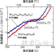 此次通過(guò)制造時(shí)的加熱處理溫度和熱處理時(shí)的氮?dú)鉂舛鹊葪l件的最優(yōu)化,實(shí)現(xiàn)了單一組成、室溫溫度條件下的零膨脹(圖2)。另外,通過(guò)優(yōu)化組成,可以不使用Ge等昂貴元素,而只使用Mn、Cu、Zn及Sn等低價(jià)元素來(lái)制造。預(yù)計(jì)此次開(kāi)發(fā)的材料可以廣泛用作半導(dǎo)體制造、超精密和微細(xì)加工及高精度測(cè)量?jī)x等多種產(chǎn)業(yè)機(jī)械的構(gòu)造材料與部件。