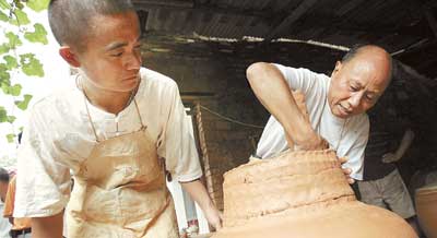 胡老耐心教徒弟錢正才學(xué)習(xí)長沙銅官窯的制作技藝。