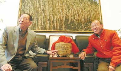 2007年11月,袁隆平院士收到胡武強(qiáng)為他創(chuàng)作的“豐收籮”,高興得贊不絕口。